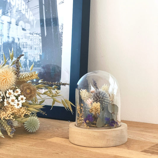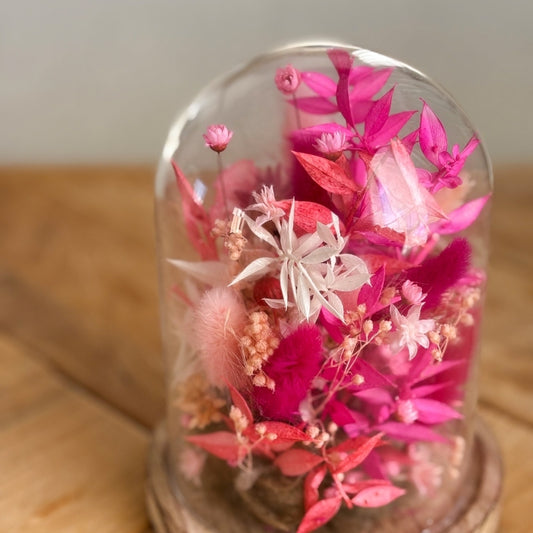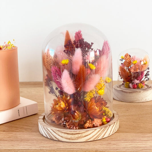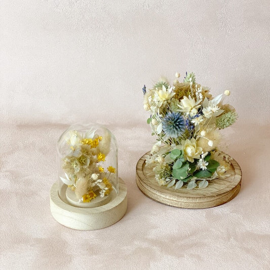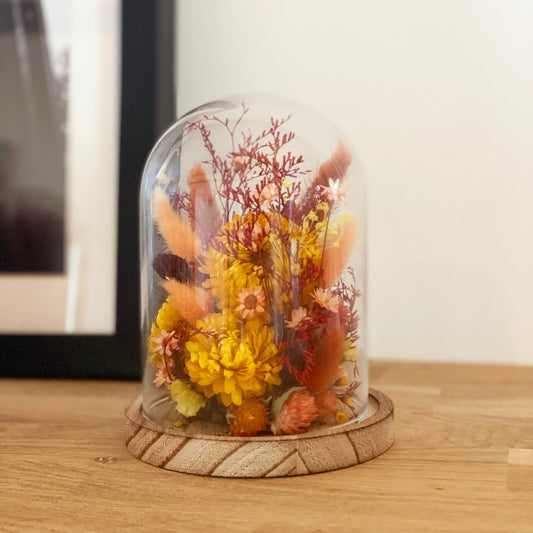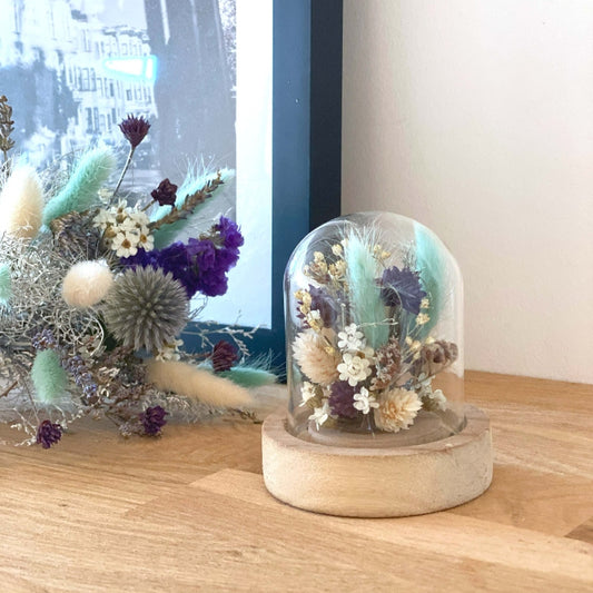 Plongez dans l'univers poétique de nos Globes Fleuris, de véritables petits jardins sous verre. Chaque globe renferme une composition florale unique, réalisée avec des fleurs séchées délicatement assemblées sous une cloche en verre. Une décoration originale et intemporelle, idéale pour offrir ou embellir votre intérieur. Livraison partout en France.