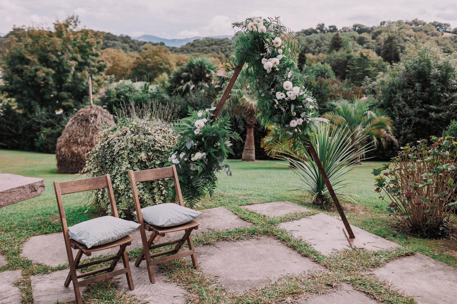 Ce projet floral a été imaginé pour un mariage naturel et champêtre au coeur du Pays Basque. Une palette vert et blanc, ponctuée de fougères, pensée en harmonie avec le caractère du domaine.